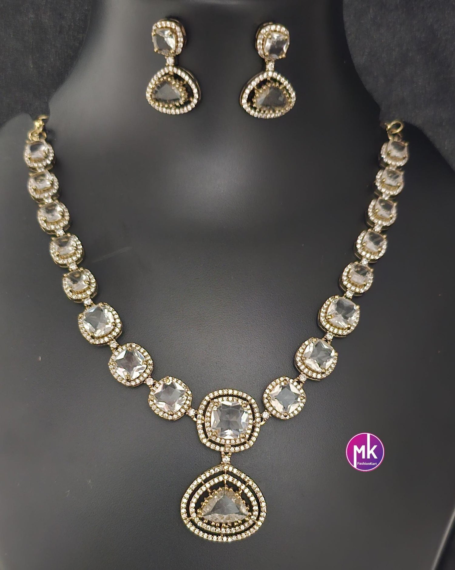 American Diamond Premium polish Gold finish Necklace with matching Earrings - Adult cum Teen Necklace - MK Fashionkart - Fashion Jewelry