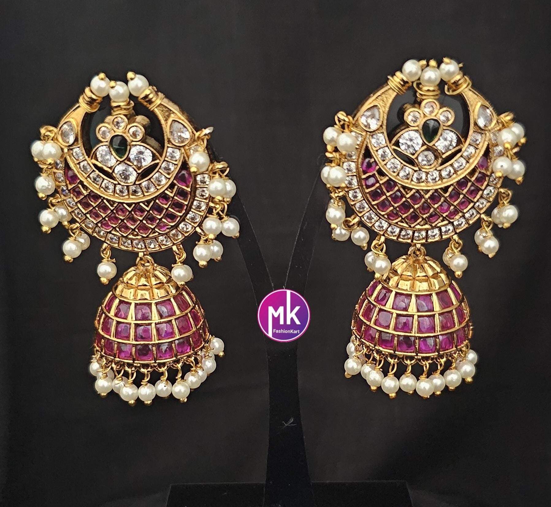 Kemp Stone Premium Quality premium polish Big chandbali Jhumka with pearl hangings - MK Fashionkart - Fashion Jewelry