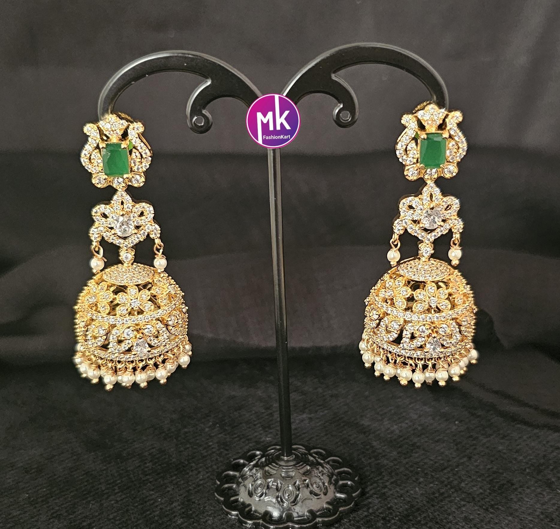 Premium Quality Gold finish long Jhumka with hangings pearls - Wedding Jhumka - Bridal Jhumka - MK Fashionkart - Fashion Jewelry